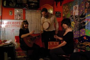 Ok, an impression of the night featuring some of the many people who did stuff: The photo is Hardcore Always, by the way, from left to right Erica, Colin & Dana. Colin complains that he doesn’t want to be “the music guy” and wants to read more stuff. Rufo says “Especially enjoyed the two plays, [Bev’s Atlanta Bus stand-off & Betrayal by shoes pieces – ed] ass rape (obviously), the black guy who sang and chanted and wailed (what’s his name?), and Troy’s lovelorn ramblings. There may have been good stuff afterwards too but that’s when I left.” Ass rape being Dana’s surprisingly fun song. Stedy was the guy chanting and wailing (& doing African-style guitar) to boulverser la verticalité du vend. Troy was in love once. In a seagreen linoleum booth at the Horseshoe Café. He claimed never to have done his stuff before, to have written his poem in 5 minutes having had to throw out a poem on the credit crunch because it didn’t fit the night’s theme, and to be only a painter. Well he did have paint on his overalls, but otherwise he’s a liar. He’s too good.