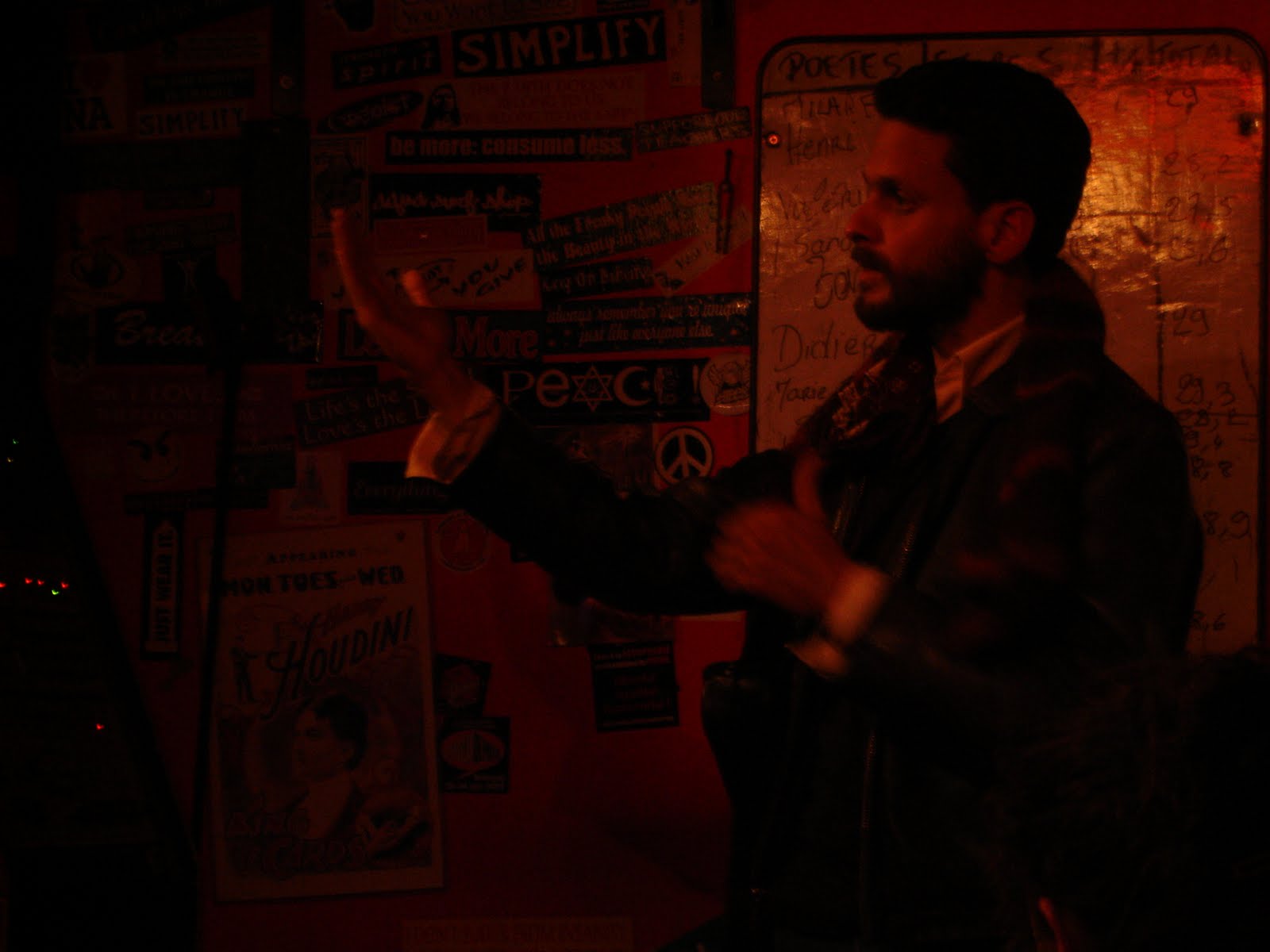 SpokenWord was a hot, sweaty cave in Paris. Look closely at the first photo and you can see Kyle standing before the door of the bar, about to go in. Patrick, the one facing the camera, with the cigarette, in the group of dodgy looking poets, later got a bucket of water thrown over him by the neighbours for singing after 1a.m.