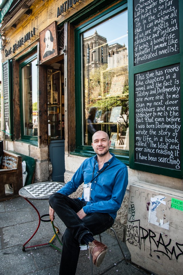 Click. Flash in my face. Damn. This place risks to become worse than the Louvre, even worse than the Catacombs, hey, hold on a second we are still alive! We are still alive! I wanted to scream. Worse than the Pere Lachaise, at least there, the writers are dead and that’s where George, the founder of Shakespeare & Co, is buried. There, not here. This, believe me, is still a real place.
